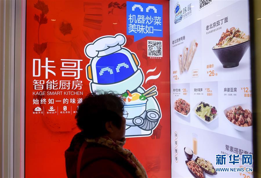 一名顧客在北京東單北大街“咔哥”智能廚房觀看推出的菜品。這家餐廳沒有廚師,而是用機器人炒菜,引來很多顧客嘗鮮(11月7日攝)。新華社記者 羅曉光 攝