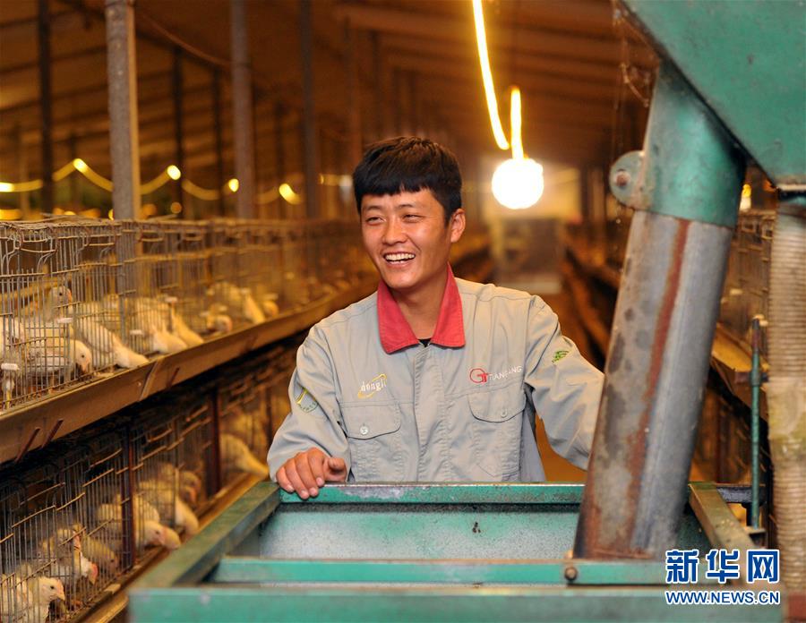 河北省海興縣張會亭鄉徐西北村建檔立卡貧困戶徐寶龍在政府幫助扶持建起的養雞場里工作(12月11日攝)。新華社記者 牟宇 攝