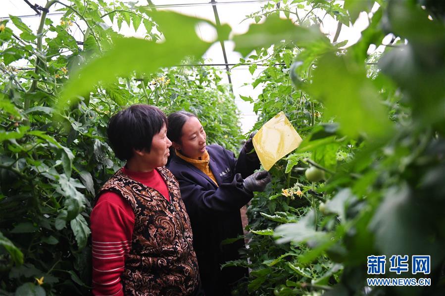 河北省唐山市樂亭縣唐山綠昕農業發展有限公司技術人員在大棚內指導菜農病蟲害綠色防控技術(11月9日攝)。 新華社記者 牟宇 攝