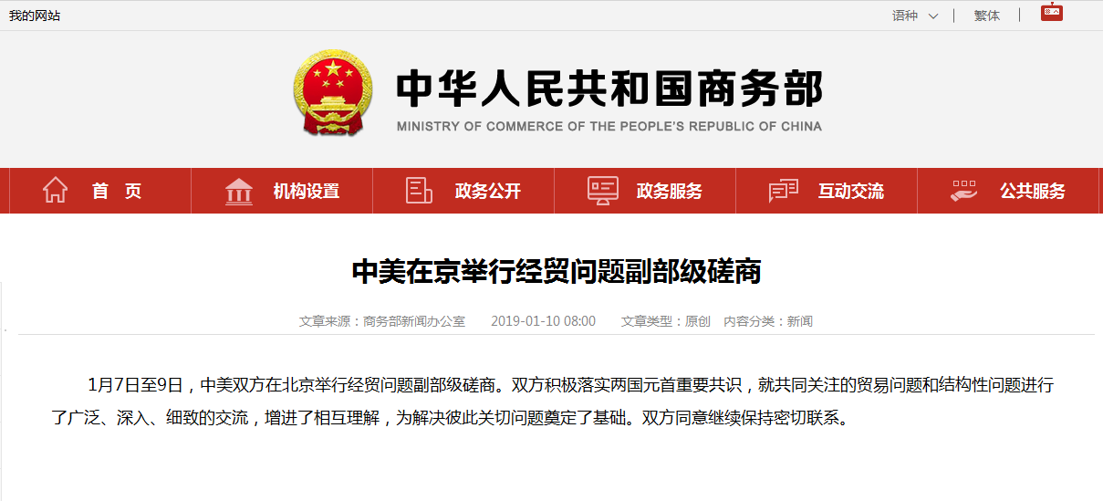 商務(wù)部聲明:1月7日至9日,中美雙方在北京舉行經(jīng)貿(mào)問題副部級磋商。雙方積極落實(shí)兩國元首重要共識,就共同關(guān)注的貿(mào)易問題和結(jié)構(gòu)性問題進(jìn)行了廣泛、深入、細(xì)致的交流,增進(jìn)了相互理解,為解決彼此關(guān)切問題奠定了基礎(chǔ)。