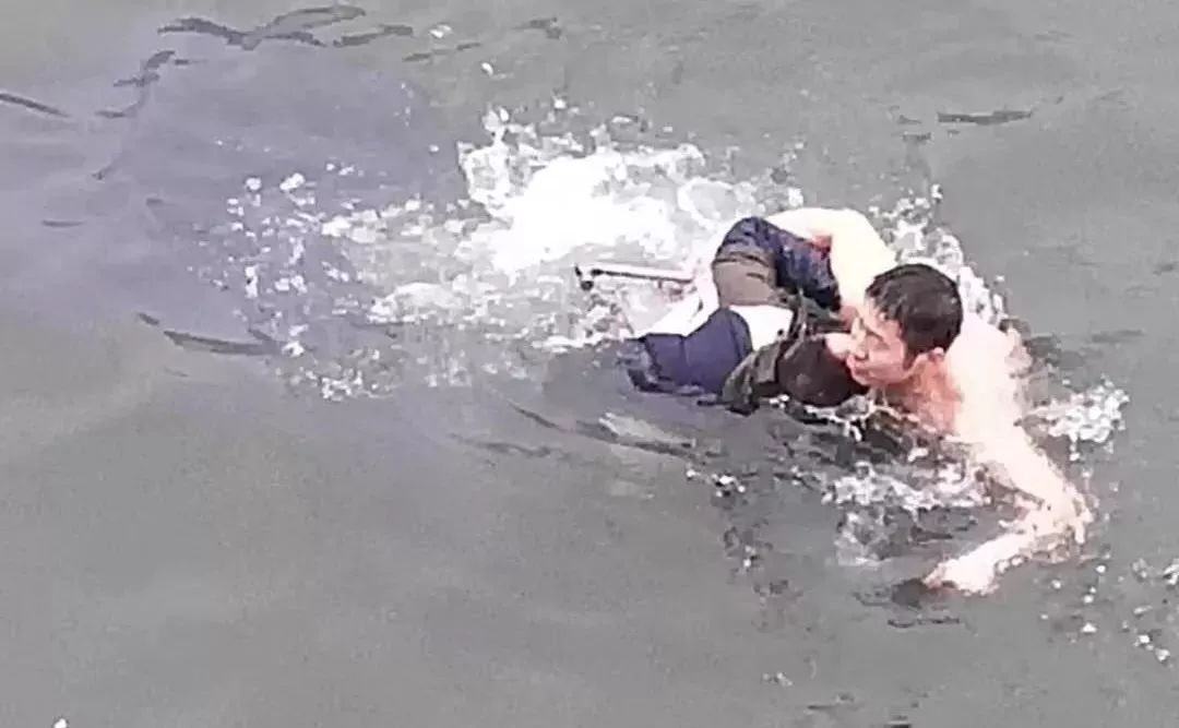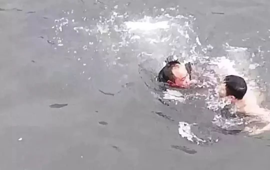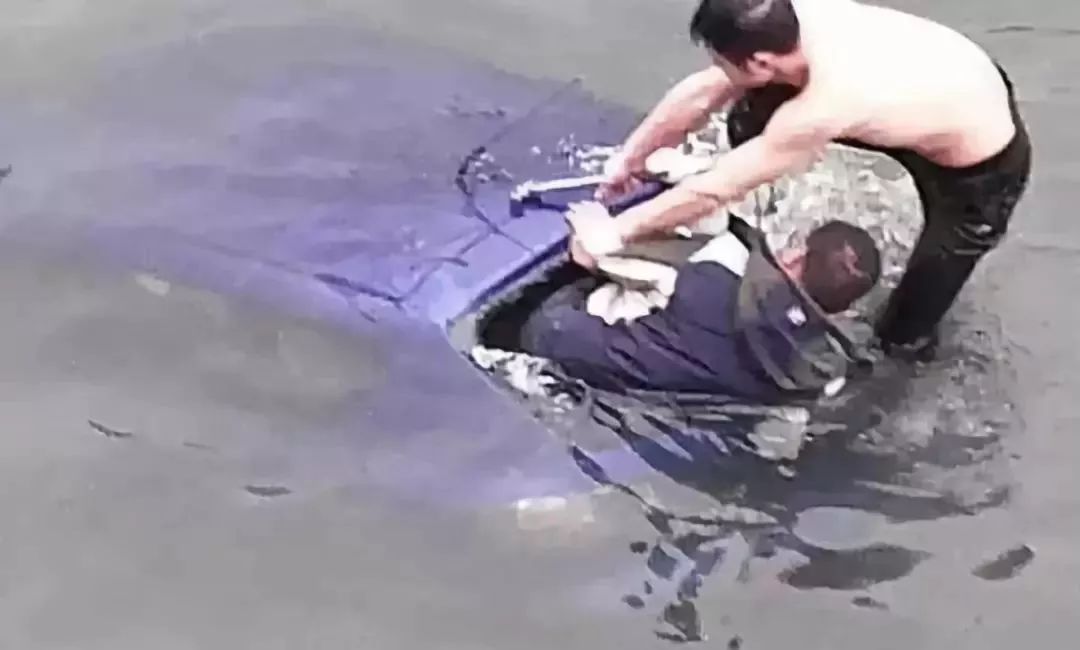 深吸口氣后迅速游到正在下沉的轎車旁,