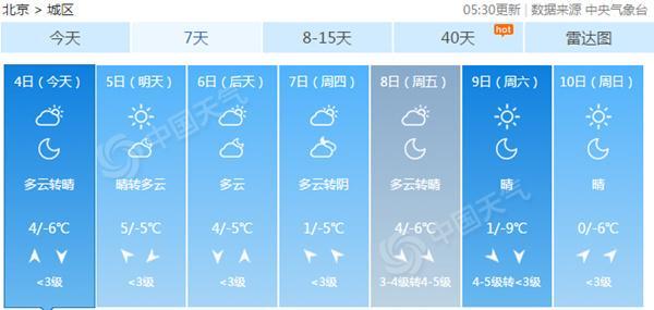 北京市氣象臺預計,今天將迎來一個晴朗的除夕,氣溫有所下降,但風力減小,體感并不會比昨天寒冷,最高氣溫4°C,最低氣溫-6°C。這樣的晴天將持續到明天,最高氣溫為5°C,最低氣溫-5°C。