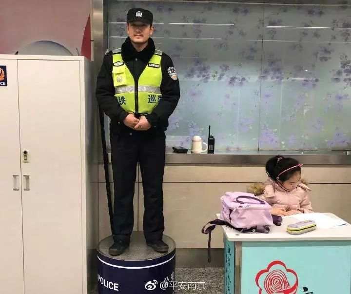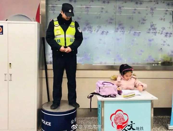 @平安南京:說好來接的媽媽還沒到,下了寒假培訓班的小女孩征得地鐵警察叔叔同意后,在旁邊認真地寫起了寒假作業。網友:厲害了,寫作業都有人守護