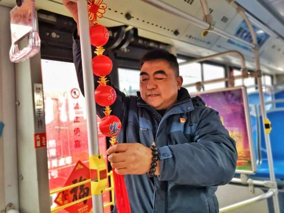 要過年了,揚子公交駕駛員徐廣寶給自己的“愛車”掛上燈籠。像他這樣春節期間一直堅守崗位的公交駕駛員,還有很多很多。