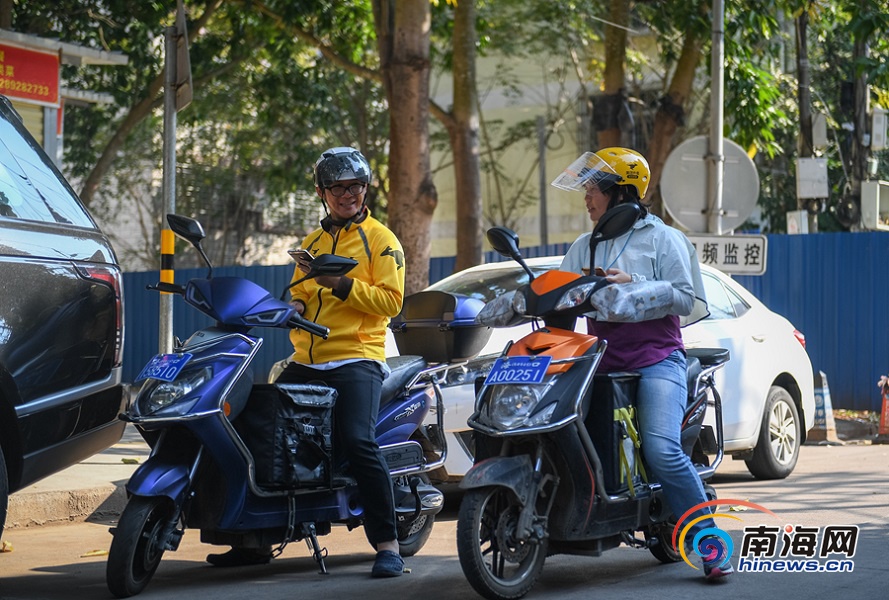 2019年2月8日,海口市龍華區南海大道,兩位快遞員休息空隙中互相打招呼。海報全媒體中心記者 袁琛 攝