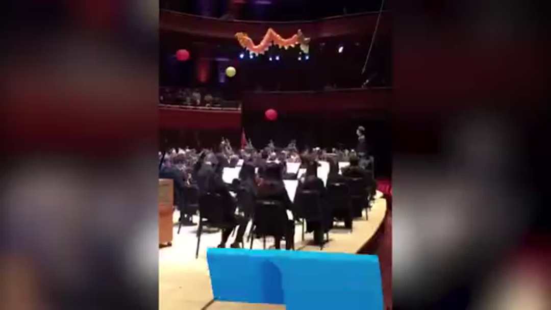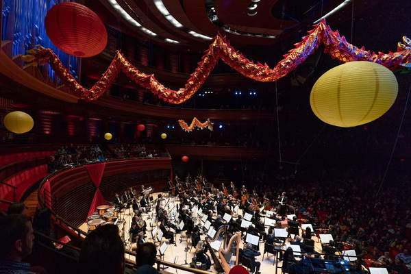 擁有2500個座位的音樂廳上空懸掛著兩條中國龍,費(fèi)城交響樂團(tuán)和遠(yuǎn)道而來的上海愛樂樂團(tuán)同臺,聯(lián)袂奏響了“費(fèi)城首屆中國新年音樂會”。