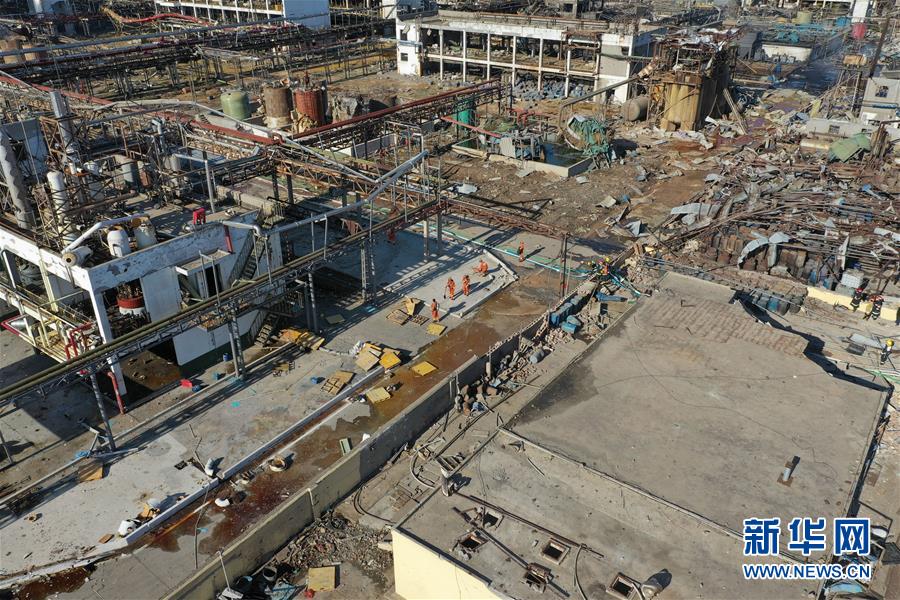 3月22日,消防隊員在江蘇鹽城響水化工廠爆炸事故現場搜救(無人機拍攝)。 新華社記者 季春鵬 攝