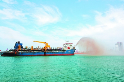 斯里蘭卡科倫坡港口城項目是中斯兩國在“一帶一路”建設(shè)中務(wù)實(shí)對接的重點(diǎn)項目,由中國交通建設(shè)股份有限公司與斯里蘭卡政府共同開發(fā)。圖為項目施工現(xiàn)場,一艘中國耙吸挖泥船正在吹沙。新華社發(fā)