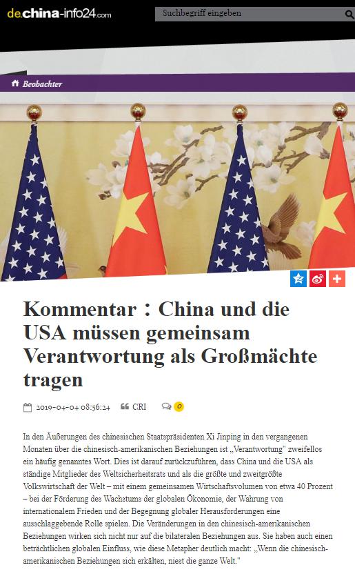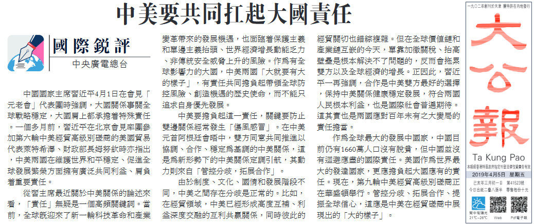 央視網消息:中央廣播電視總臺“國際銳評”4月4日刊播題為《中美要共同扛起大國的責任》的文章。眾多境外媒體和網站轉發。