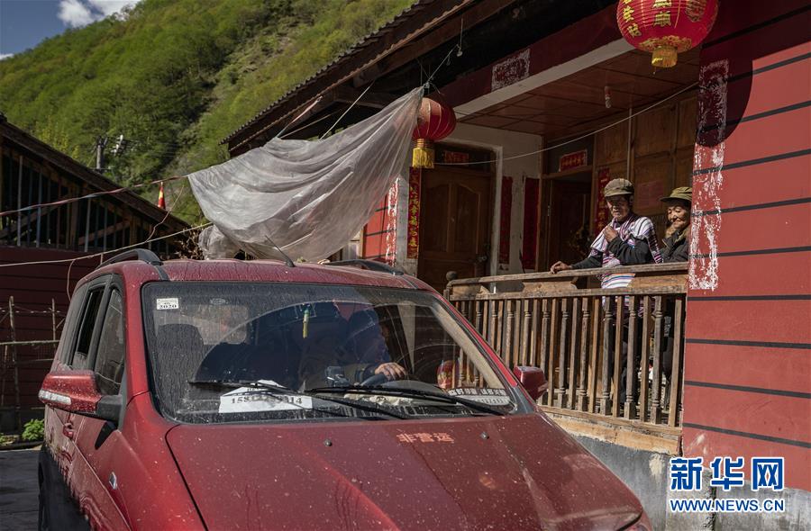 4月13日,云南省貢山縣獨龍江鄉獻九當村迪蘭村民小組村民李新榮(右二)看著兒子開車進院。 新華社記者江文耀攝