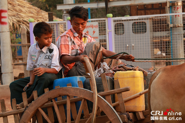 皎勃東地區(qū)的村民趕著牛車來中緬油氣管道項目援建的水井打水(洪荃詮 攝)