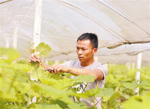 5月2日,江西省吉水縣醪橋鎮(zhèn)西坑村生態(tài)家庭農(nóng)場,劉國富在葡萄園剪枝。劉國富從北京返鄉(xiāng)創(chuàng)辦了國富生態(tài)家庭農(nóng)場,帶領(lǐng)當(dāng)?shù)匕傩彰撠氈赂弧?廖 敏攝(中經(jīng)視覺)
