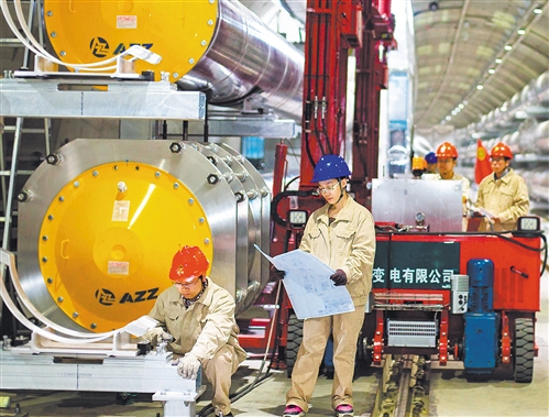 5月1日,江蘇省常熟市,全球首條特高壓輸變電工程蘇通GIL綜合管廊電氣施工現(xiàn)場,“90后”博士生陳春超(左一)與“90后”碩士生原睿萌(左二)在組裝管廊電氣設(shè)備。該工程項目全長5468.5米,被稱為“萬里長江第一廊”。湯德宏攝(中經(jīng)視覺)