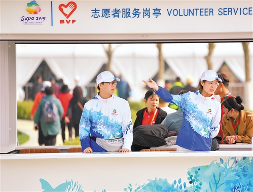 5月1日,北京世園會,來自北京郵電大學(xué)世紀學(xué)院的大學(xué)生志愿者徐小雯(右一)在為游客熱情服務(wù)。本報記者 高興貴攝