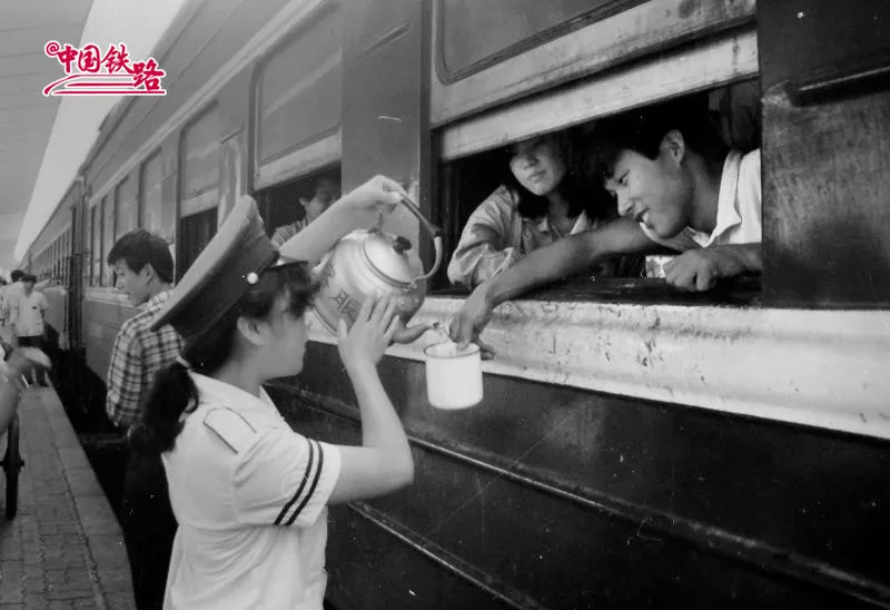 上圖:上世紀90年代初,站臺服務員正在送水。