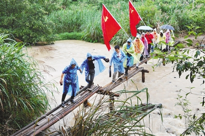 6月13日,參加“記者再走長(zhǎng)征路”主題采訪活動(dòng)的記者們,在江西于都縣祁祿山沿著當(dāng)年中央紅軍長(zhǎng)征走過(guò)的“紅軍小道”冒雨行進(jìn),體驗(yàn)紅軍穿越深山峽谷的艱苦行程。 夏康健 郭智勇攝影報(bào)道