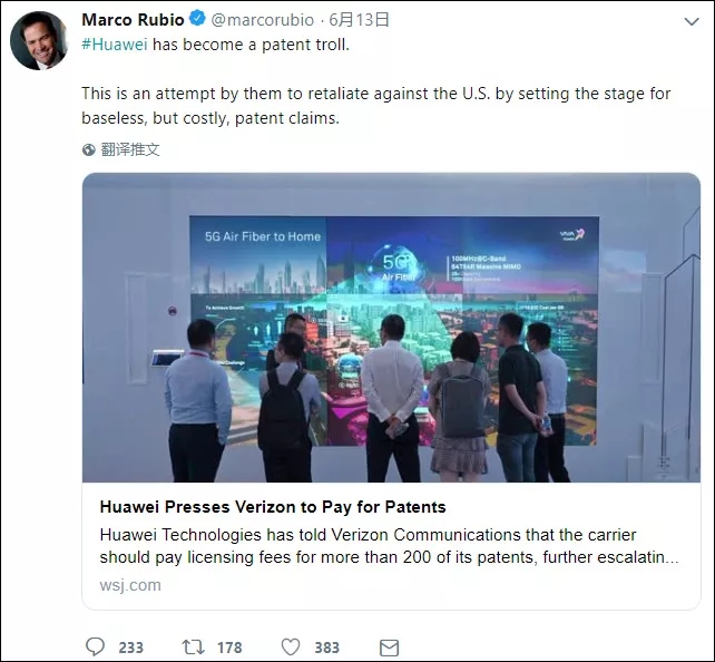 作為美國(guó)反華政客中最激進(jìn)最極端的一個(gè)人,盧比奧多次叫嚷中國(guó)“偷”美國(guó)“知識(shí)產(chǎn)權(quán)”。但是聽(tīng)到這個(gè)消息后,他立馬撤下了那套“捍衛(wèi)者”的偽裝,給合理維權(quán)的華為扣上“專(zhuān)利流氓”的帽子,還宣稱(chēng)華為的專(zhuān)利都是“沒(méi)有依據(jù)”的。