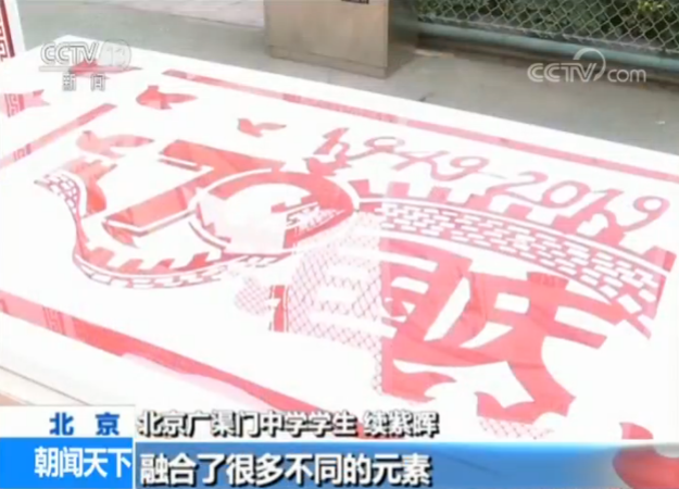 北京廣渠門中學學生 續紫暉:這整幅剪紙作品融合了很多不同的元素,比如說萬里長城、和平鴿。我們想通過用這樣的剪紙的藝術方法,來表達我們對祖國的和平與發展的一個祈愿。