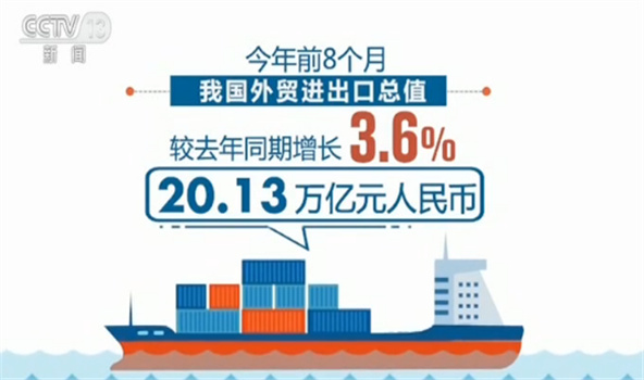 海關統計顯示,今年前8個月,我國外貿進出口總值20.13萬億元人民幣,較去年同期增長3.6%,其中出口10.95萬億元,同比增長6.1%,進口9.18萬億元,同比增長0.8%。