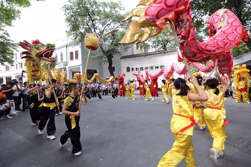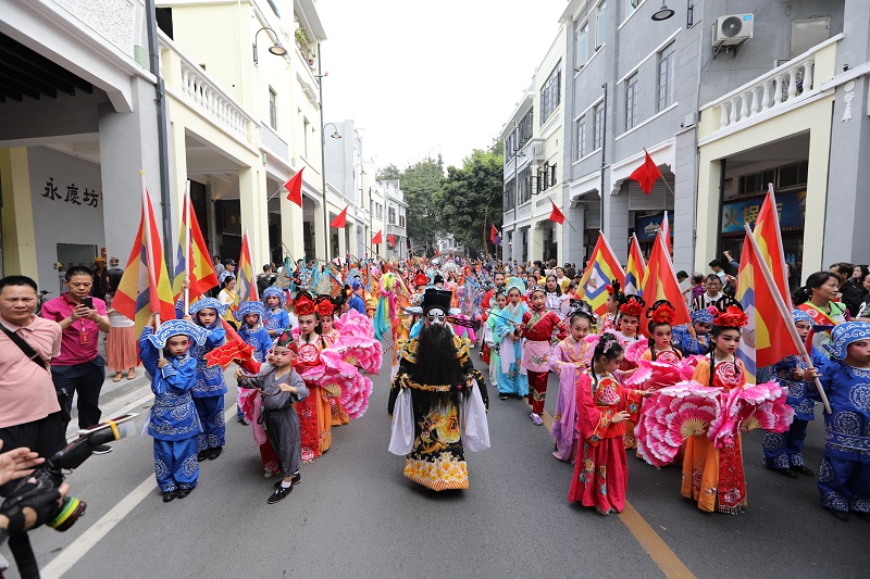 快閃結束后,由荔灣社會各界相關代表組成的約400人的舞龍舞獅、戲曲等方陣隊伍,從恩寧路永慶坊二期巡游到永慶坊一期,進入永慶坊、粵劇藝術博物館廣福臺廣場,展現了粵劇粵曲、“三雕一彩一繡”等嶺南特色非遺項目。