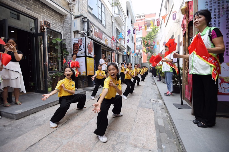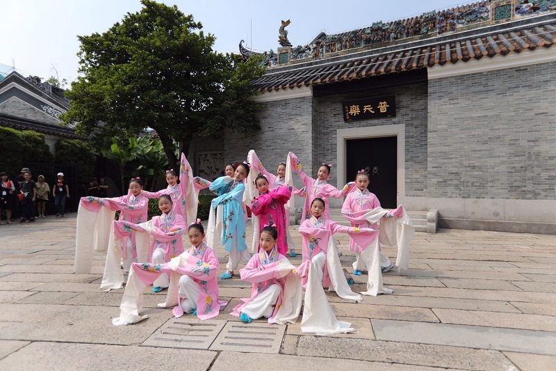 24日下午,在廣州粵劇藝術博物館、永慶坊等歷史建筑周邊拉開了一場快閃活動。一群身穿粵劇衣服的小朋友們甩著水袖、踏著蓮步出場;顒邮紫仍诨泟∷囆g博物館普樂天廣場前拉開序幕,由來自荔灣區青少年宮的小演員們表演原創曲目《小小水袖展芳菲》,現場吸引了眾多游客。其余四個快閃地點分別為鑾輿堂、李小龍祖居、八和會館、永慶坊二期金聲廣場。來自粵劇藝術博物館少兒傳承基地的小演員和荔灣區五眼橋小學的學子也參與了快閃表演,包括粵劇、武術、紅歌表演等。