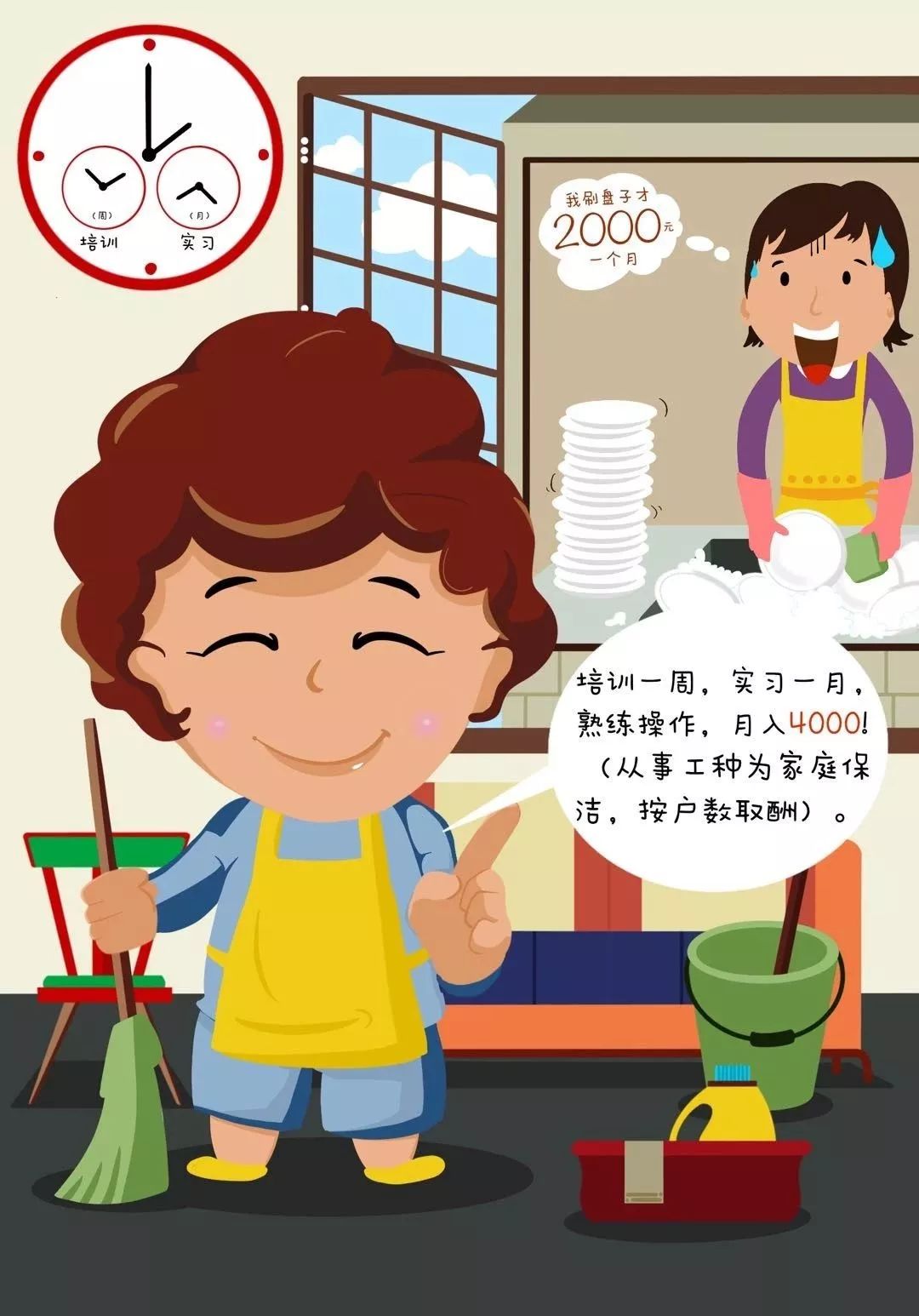 算完絕對收入,第一書記還給陳大姐算相對收入:村里人在城里打工,婦女主要是去餐館刷盤子端菜,一個月1200元左右,最高不超過2000元。但是做家政保底3000元,只要肯干,多包幾家的保潔業務,一個月輕輕松松能上4000元。比在餐館打工翻一倍。