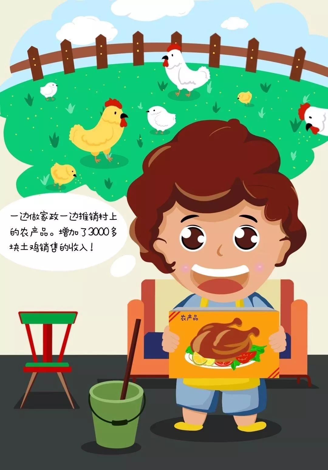 在駐村工作隊的啟發和指導下,陳大姐不光做家政,還利用做家政的機會向業主推銷自己家里的優質農產品。陳大姐家里喂養的30多只土雞被城里的業主搶購一空,土雞蛋、麻鴨蛋這些農特產品也供不應求,僅僅靠賣農產品,又增收了3000多元。