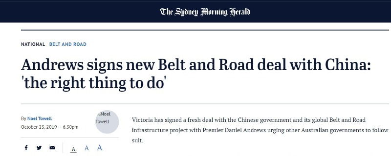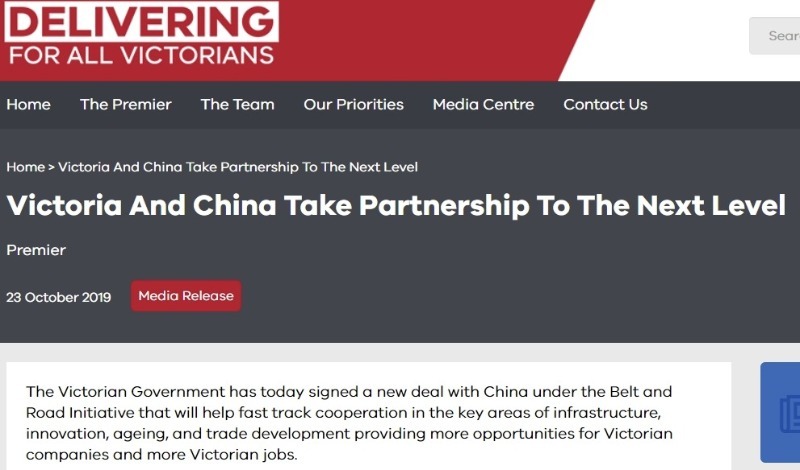 維多利亞州政府的官方聲明顯示,安德魯斯州長與中國國家發展和改革委員會簽署了框架協議,這是維多利亞州與中國關系密切的另一個跡象。此前,雙方于2018年簽署了“一帶一路”諒解備忘錄。