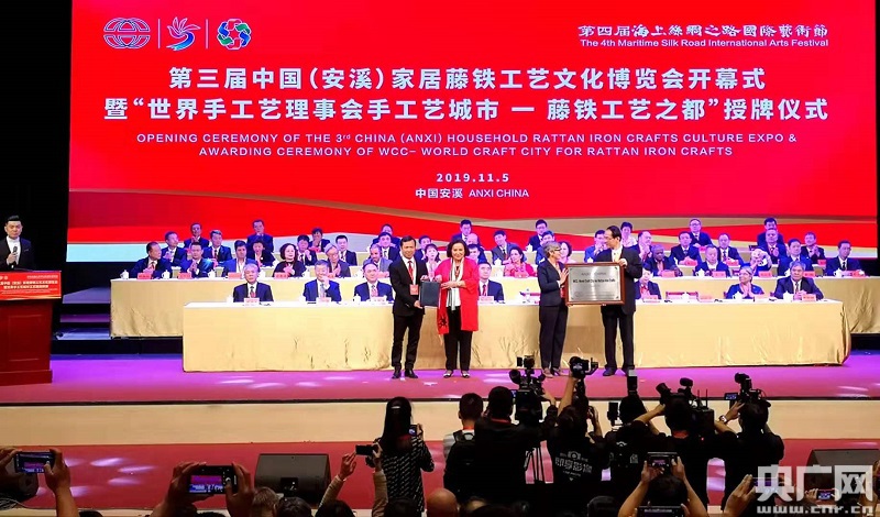 開幕式上,舉行了“世界手工藝理事會手工藝城市——藤鐵工藝之都”授牌儀式。世界手工藝理事會羅茜·格林麗絲主席、世界手工藝理事會亞太地區嘎達·席佳薇主席蒞臨為安溪頒發牌匾。