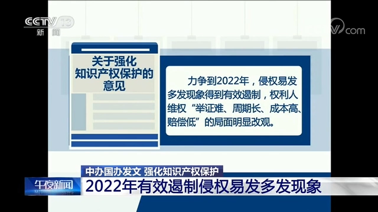 央視網消息:近日,中共中央辦公廳、國務院辦公廳印發了《關于強化知識產權保護的意見》(以下簡稱《意見》)并發出通知,要求各地區各部門結合實際認真貫徹落實。