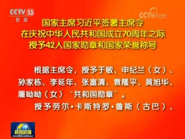 2019年9月17日,國家主席習(xí)近平簽署主席令,根據(jù)十三屆全國人大常委會第十三次會議表決通過的全國人大常委會關(guān)于授予國家勛章和國家榮譽稱號的決定,授予42人國家勛章、國家榮譽稱號。