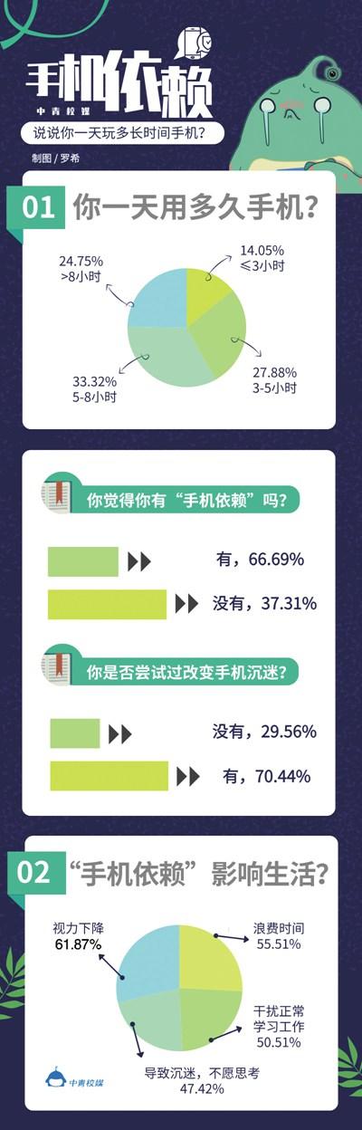 中青校媒調查顯示,62.69%被調查者認為自己過度依賴手機。被調查者中,80.75%的人認為,長時間使用手機是浪費時間,最好可以適度使用。