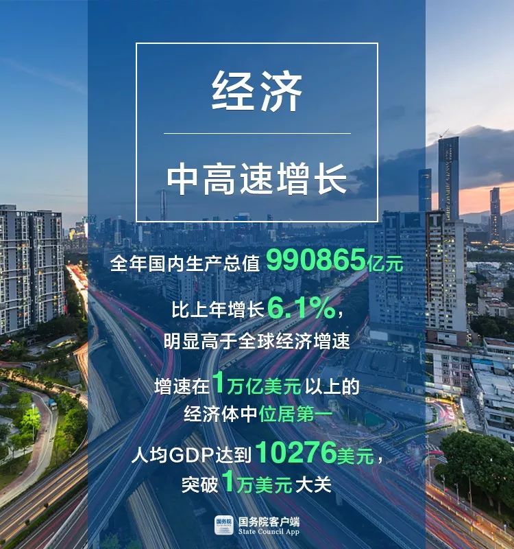 國家統計局1月17日上午公布2019年國民經濟運行情況數據,初步核算,全年國內生產總值990865億元,年末中國大陸總人口140005萬人,人均國內生產總值10276美元,經濟運行總體平穩,發展主要預期目標較好實現。2019中國經濟有哪些特點?一起來看——