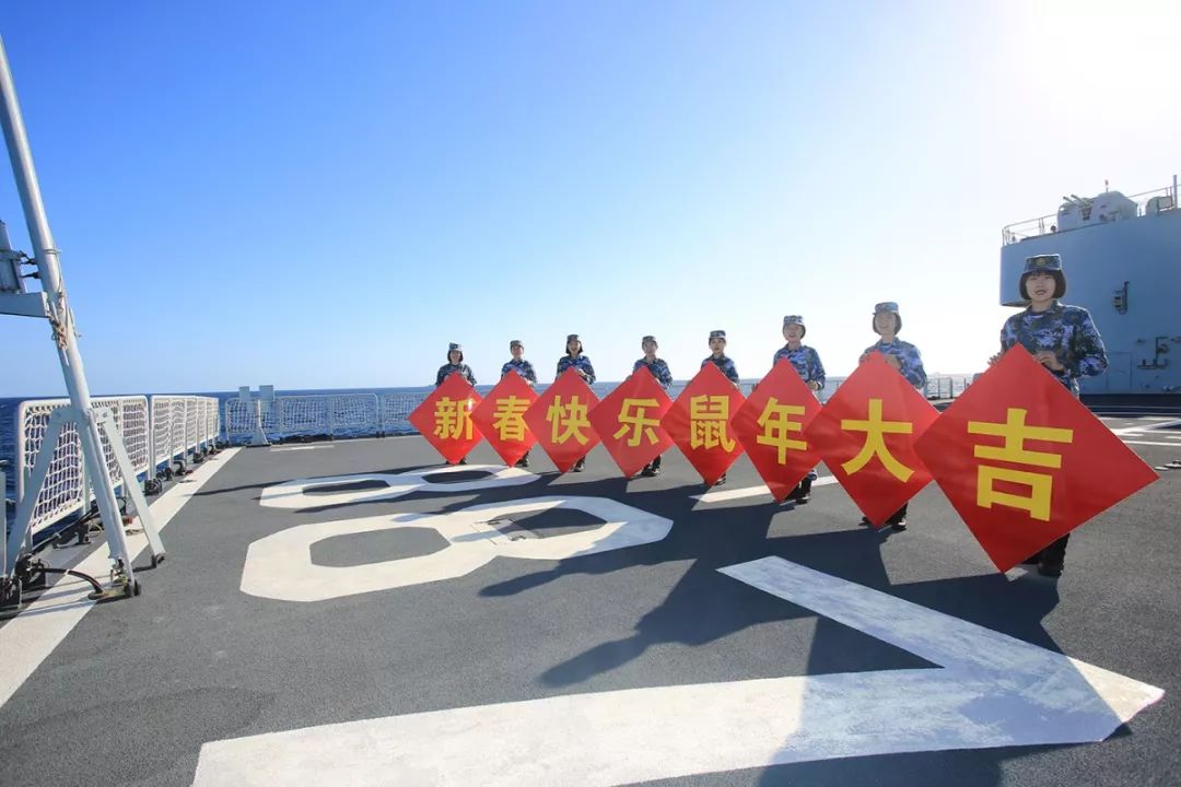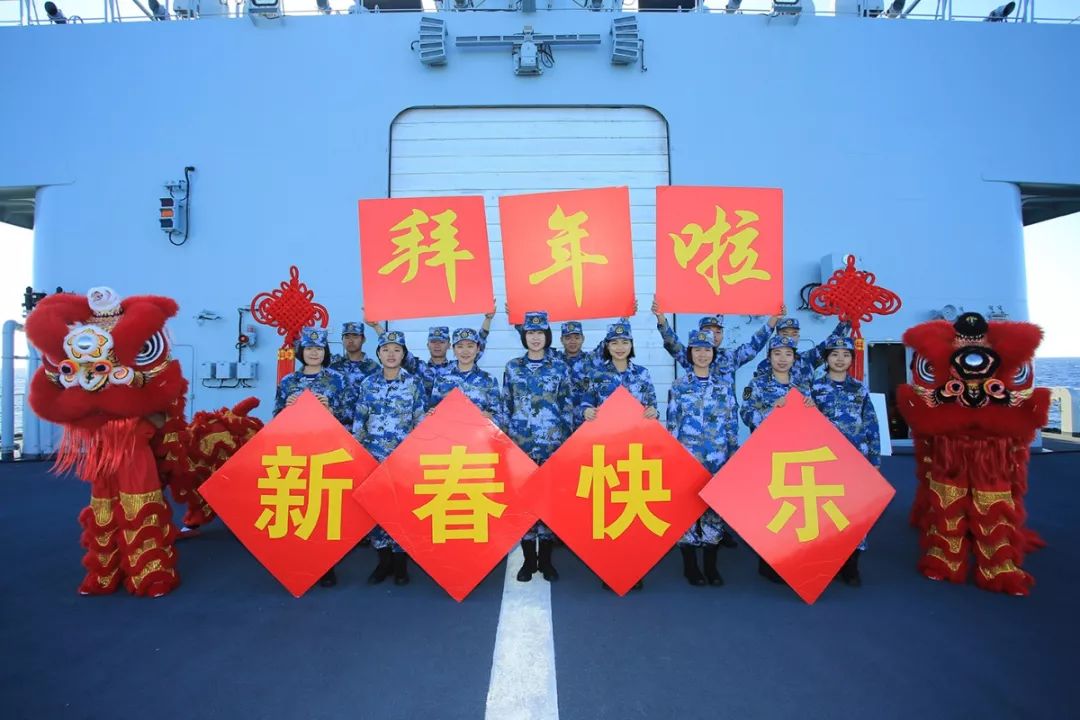 △官兵在飛行甲板上恭祝全國人民新春快樂。蔡盛秋 攝