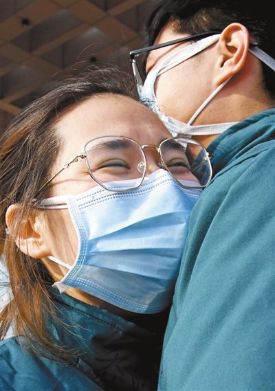 河南省直第三人民醫院的劉光耀(右)和喬冰是一對“90后”情侶,一起報名參加援鄂醫療隊。2月2日,醫療隊出發前,兩人擁抱著相互鼓勁。
