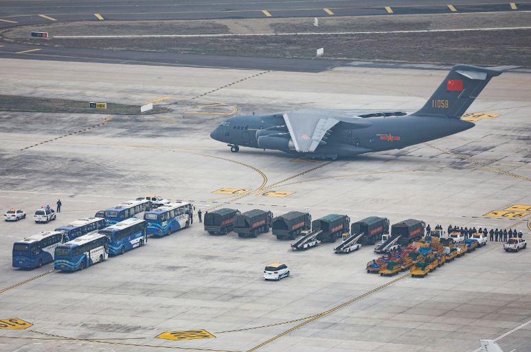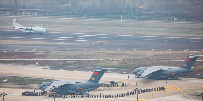 2月13日凌晨,空軍出動包括中國自主研制的6架運20在內的3型11架運輸機,分別從烏魯木齊、沈陽、西寧、天津、張家口、成都、重慶等7地機場起飛,向武漢空運軍隊支援湖北醫療隊隊員和物資。上午9時30分許,11架運輸機全部抵達武漢天河機場。