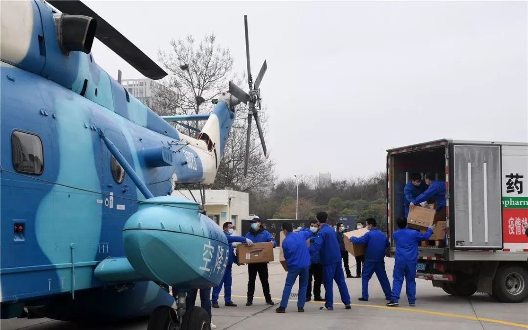 2月12日,應湖北省疫情防控指揮部請求,中部戰區緊急調派由航空工業研制生產在駐鄂空降兵某空中突擊旅直升機團服役的兩架國產直8大型運輸直升機,由武漢市向襄陽、宜昌地區轉運口罩、防護服、手套、藥品等600件共計4噸防疫醫療急需藥品和緊缺物資。