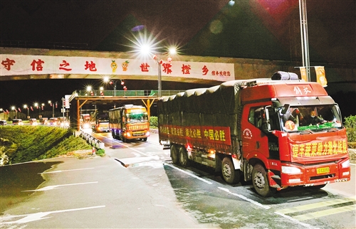 2月15日,滿載江西信豐、龍南兩地30萬斤愛心蔬菜的12輛貨車開往湖北省武漢市,這些蔬菜將配送給武漢一線醫院及社區居民。 李 健攝(中經視覺)