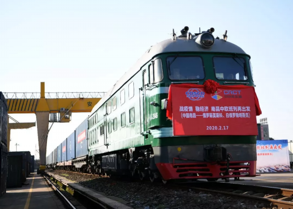 2月17日9時58分,滿載著41車40英尺集裝箱的中歐班列由南昌(向塘)國際陸港橫崗站發出,駛向俄羅斯莫斯科和白俄羅斯明斯克。