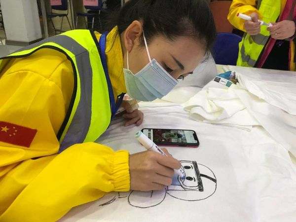 武漢志愿者在T恤上涂鴉 徐敬陽 供圖