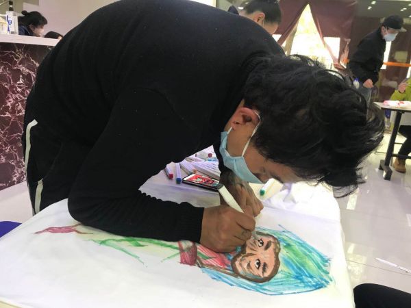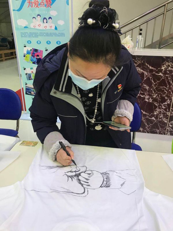 僅僅一天多的時間就完成了620件文化衫的涂鴉工作。其中有250件由鋼花小學(xué)、鋼城四小的小學(xué)生創(chuàng)作完成,另外370件出自社區(qū)志愿者、在校大學(xué)生和愛心群眾之手。