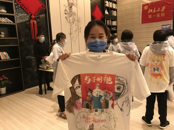 徐敬陽介紹,他給每位醫(yī)護人員準(zhǔn)備了兩件文化衫,正面都印有專門設(shè)計的“與子同袍”的字樣和醫(yī)護等戰(zhàn)“疫”一線人物群像圖案,“一件可以經(jīng)常穿,另一件因為有涂鴉,不能洗,可以留作紀念。”
