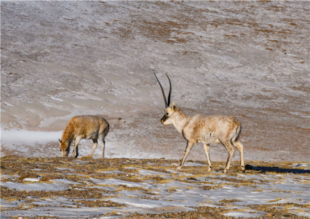 一雄一雌藏羚羊在藏北草原上覓食(1月10日攝)。新華社記者 周健偉 攝