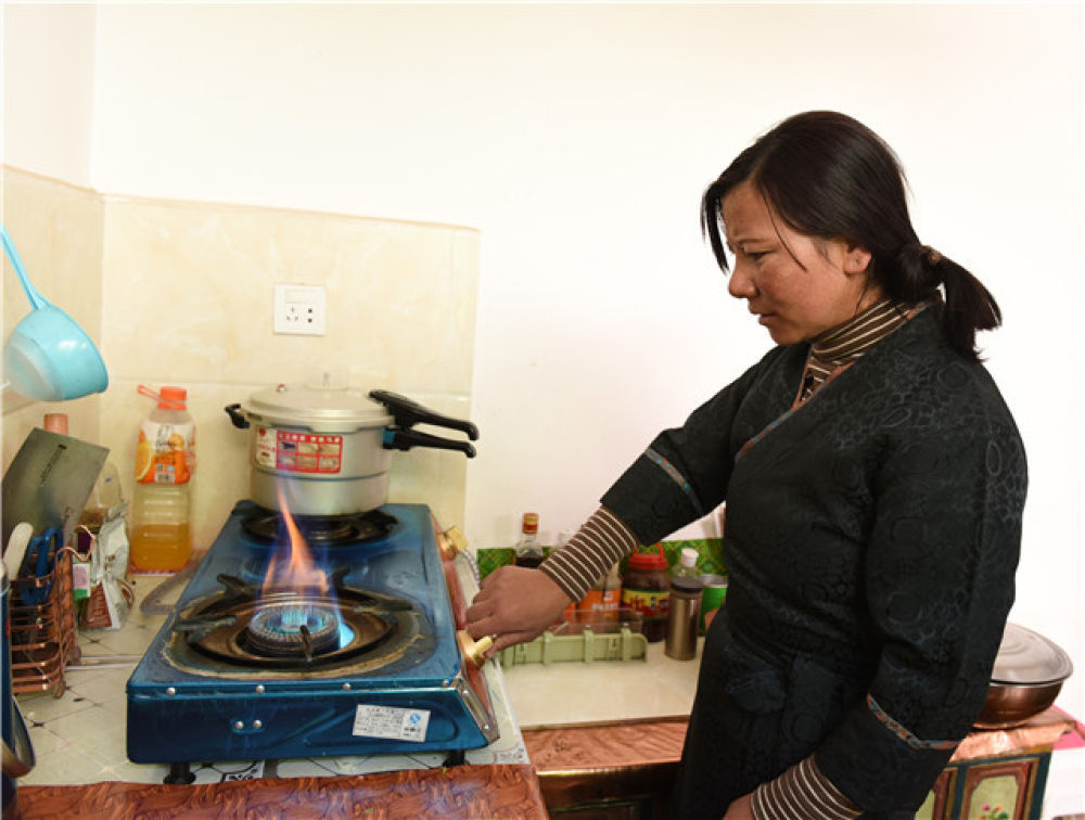 在西藏山南市貢嘎縣森布日安置點,次仁卓嘎做飯第一次用上了燃氣灶(1月12日攝)。新華社記者 田金文 攝