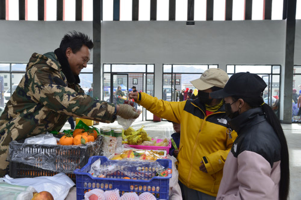 在西藏山南市貢嘎縣森布日安置點的農貿市場里,新居民在買水果(1月12日攝)。新華社記者 田金文 攝