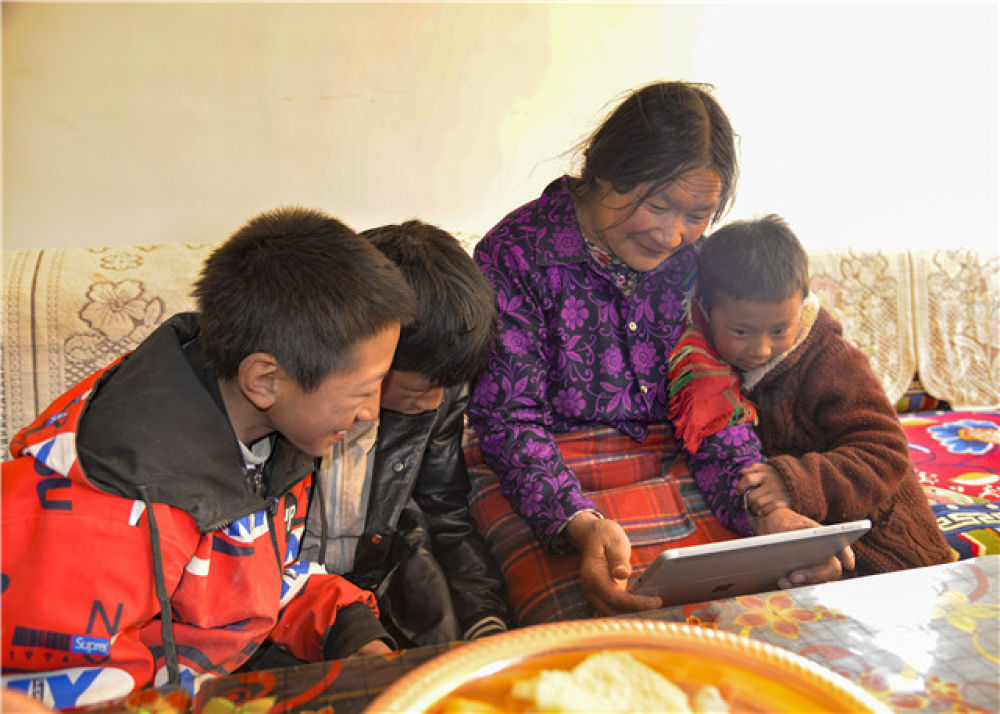 在西藏山南市貢嘎縣森布日安置點的新家里,看到記者從雙湖帶來爸爸媽媽的視頻留言,15歲的尼瑪次仁(左一)和奶奶以及弟弟妹妹笑得合不攏嘴(1月12日攝)。新華社記者 田金文 攝
