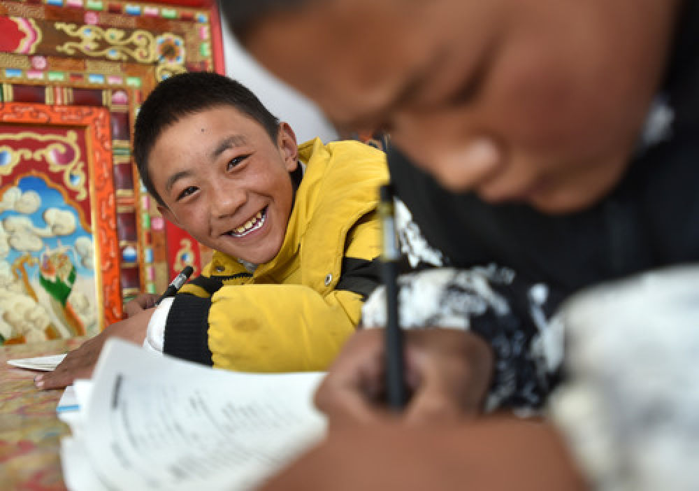 在西藏山南市貢嘎縣森布日安置點,14歲的貢覺加錯在新家復習功課(1月20日攝)。 新華社記者 覺果 攝
