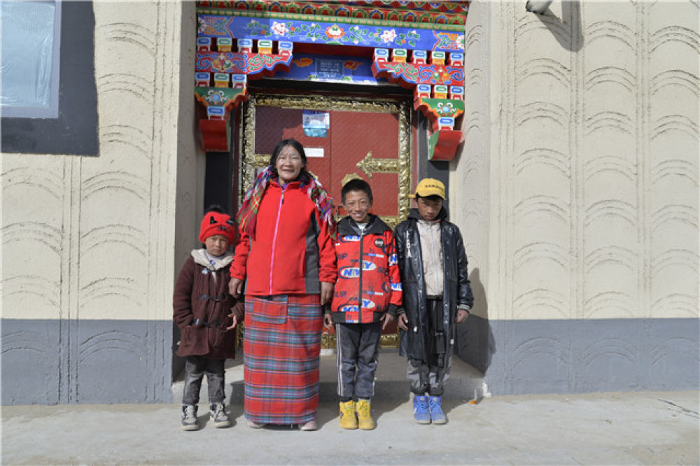 在西藏山南市貢嘎縣森布日安置點,扎西的媽媽和扎西的孩子們在新家門前留影(1月12日攝)。新華社記者 田金文 攝