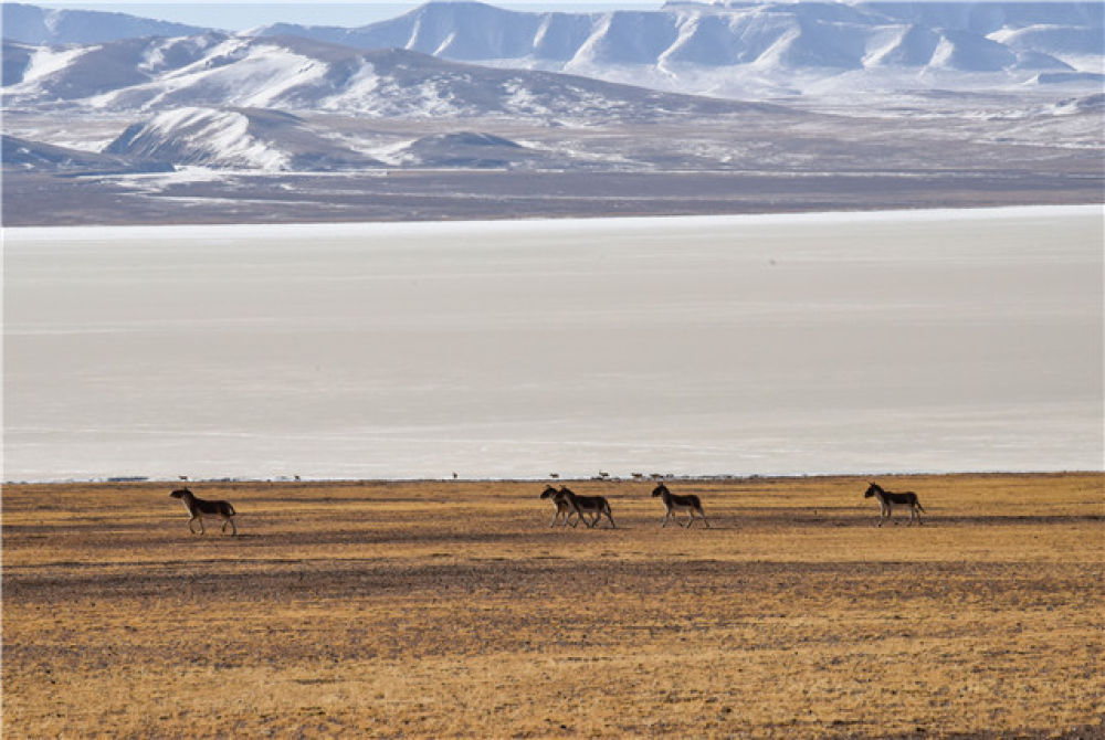一群藏野驢在羌塘草原上奔跑(1月10日攝)。新華社記者 周健偉 攝
