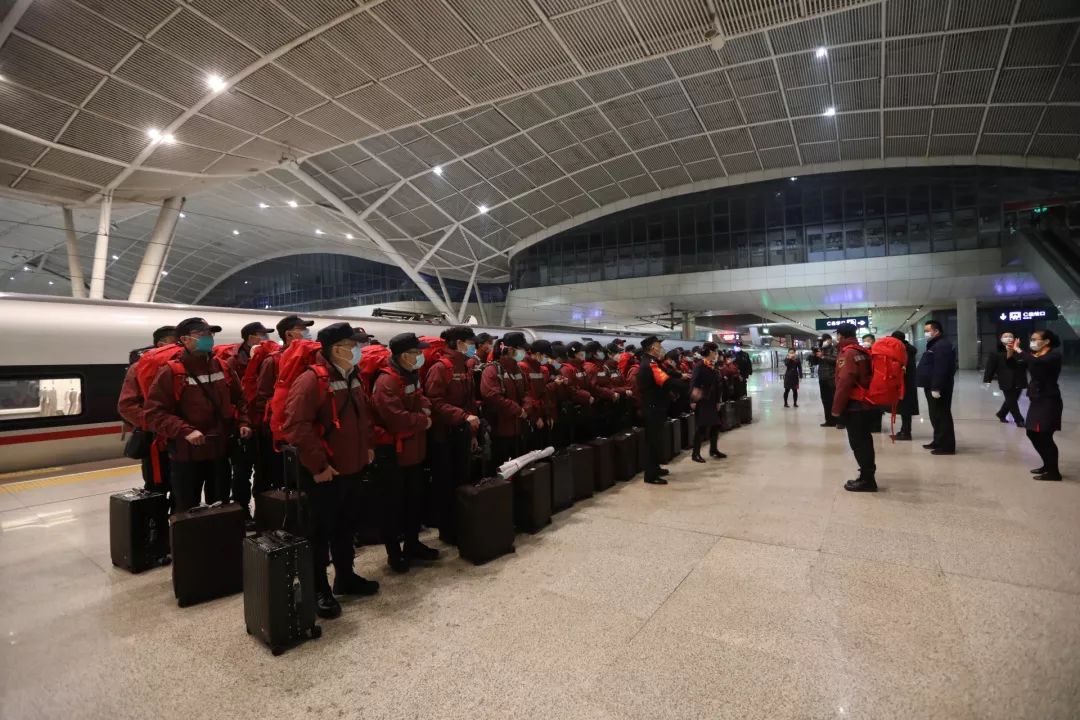 廣東省第二人民醫院國際應急醫療隊57名隊員在廣州火車南站搭乘高鐵到達武漢